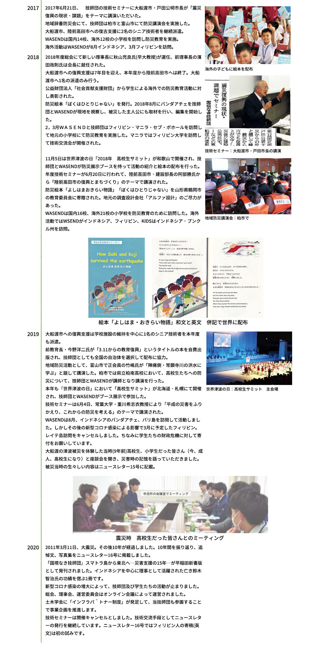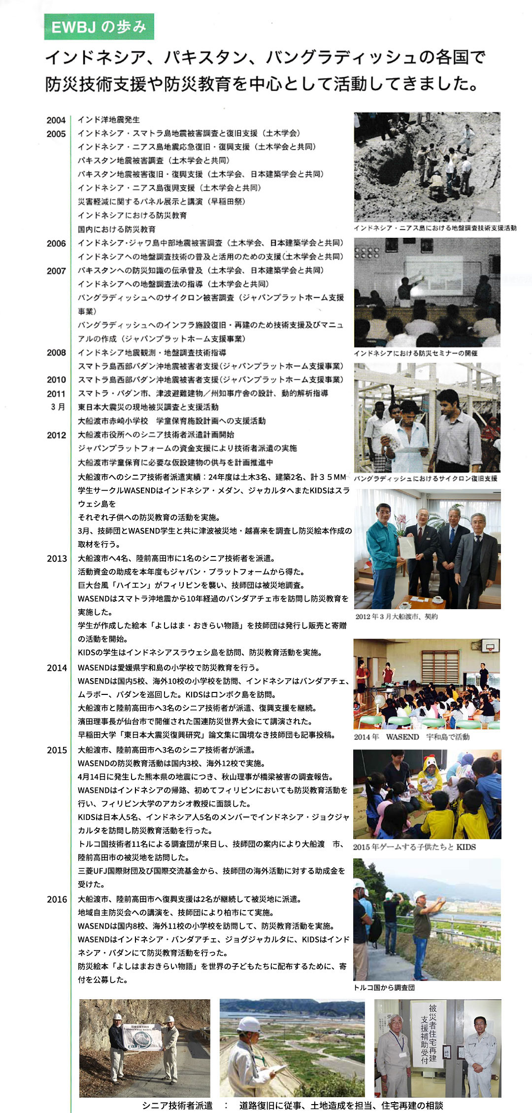 自然災害によって被害を受けた住宅、建物および橋梁、港湾施設、河川堤防などの社会基盤施設の診断を行い、継続使用の可否を判定し、被災構造物の修復方法を提案する。さらに被災地の復旧と復興に関して技術者集団の観点より行政機関や地域住民へ提言を行う。